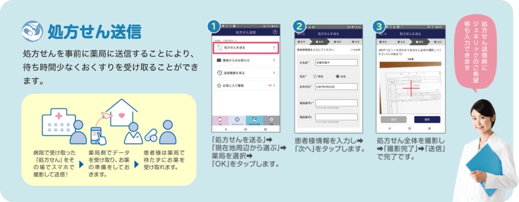 スマートフォンのアプリケーションで処方箋の画像を薬局に送信する事ができます。例えば岡山市内の医療機関を受診し、その場で処方箋画像を薬局に送信いただければ、薬の準備が出来た段階で薬局から患者様のスマートフォンに連絡がいく仕組みになっています。その際に在庫がないお薬が処方されていた場合は翌日何時以降に準備が出来ますなどお伝えする事が可能です。実際に薬局に来局いただくのは1回で済みます。非常に便利なシステムですので是非ご活用ください。